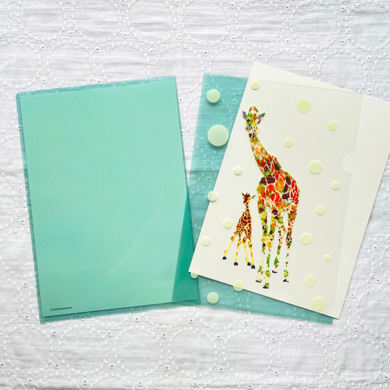 ということで、以前から定番で人気のあるデザイン「ネコフェイス」と「キリンの親子」のクリアファイルを作りました。