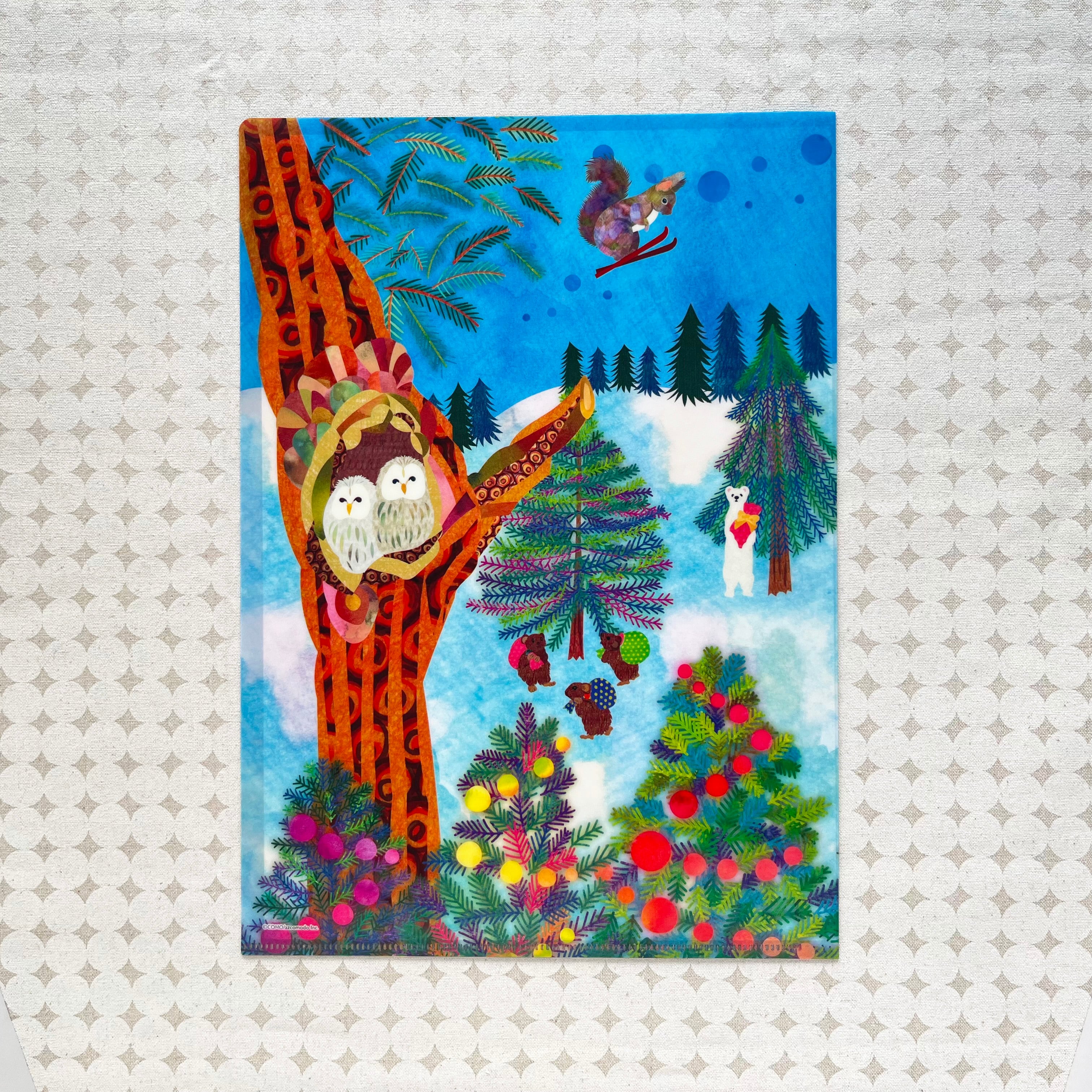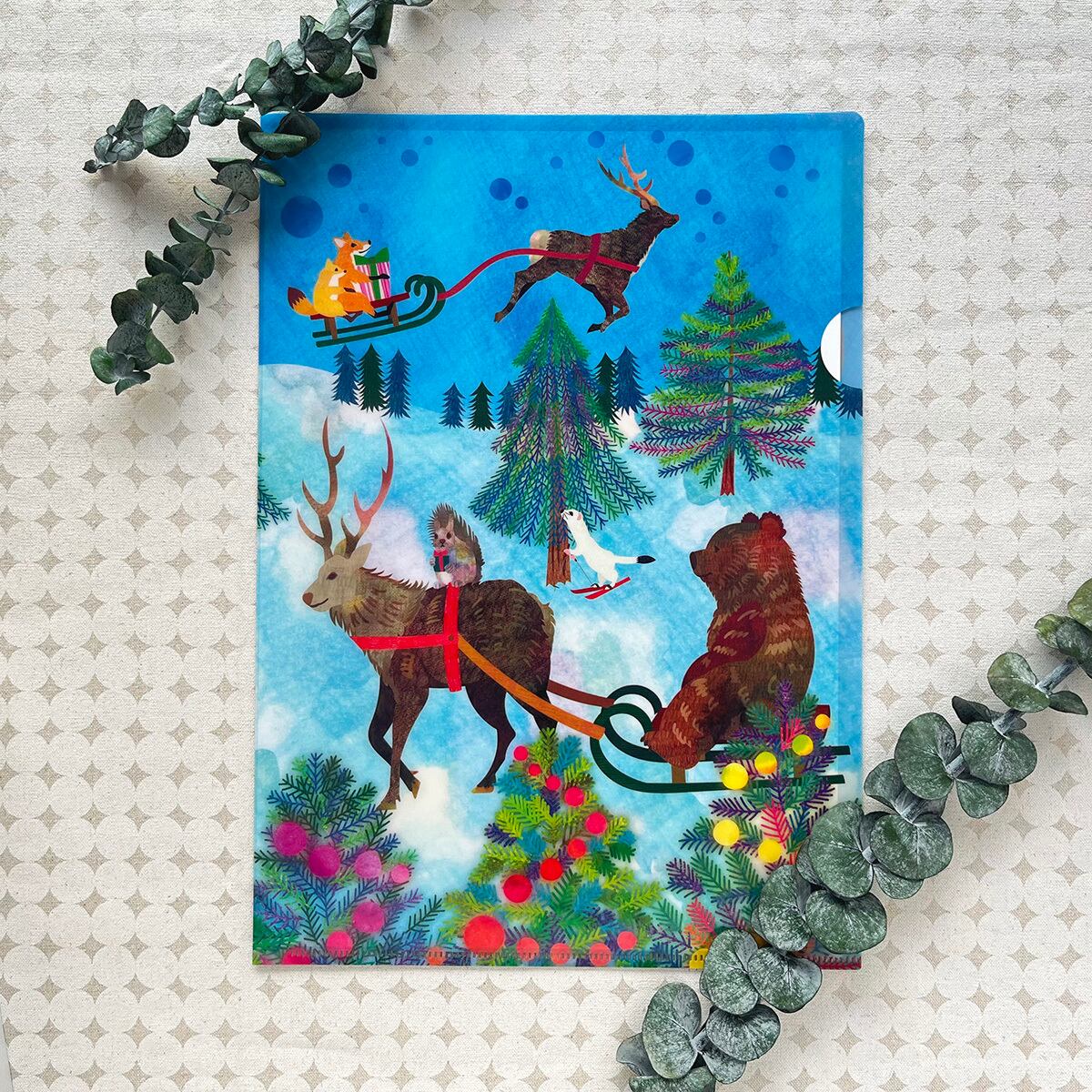 2024年冬の新作「北の動物たちの冬支度」はエゾヒグマが乗るソリをエゾシカがひいているところをメインに、エゾリス・キタキツネ・エゾテンなどの小動物がかわいく描かれています。